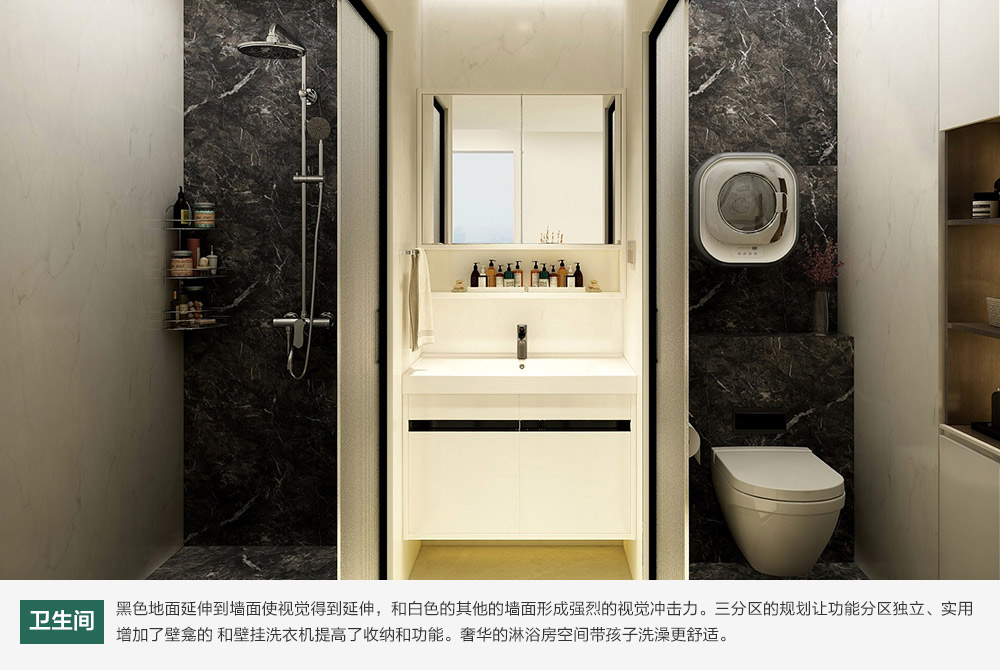 利用U形原理把卫生间做成三分区、每个功能区独立存在,使用时互不影响,彻底做到干湿分区、空间独立、增加了收纳功能。